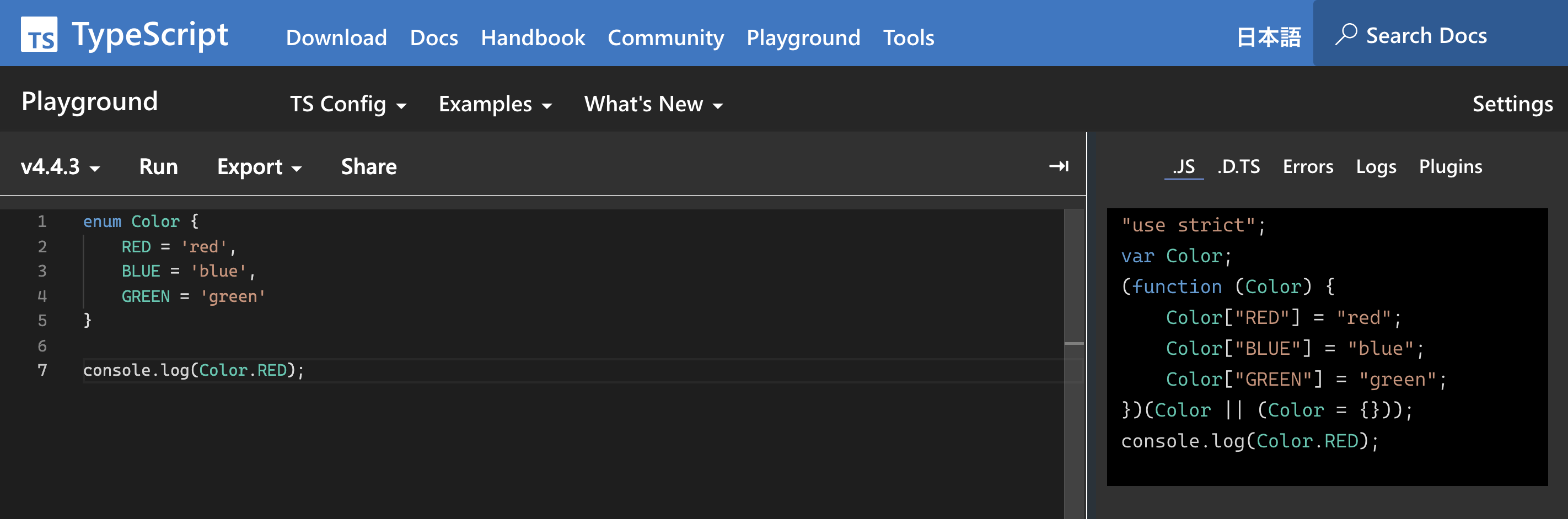 TypeScript がenumをどのように JavaScript へコンパイルしているか簡単に確認することができます。
